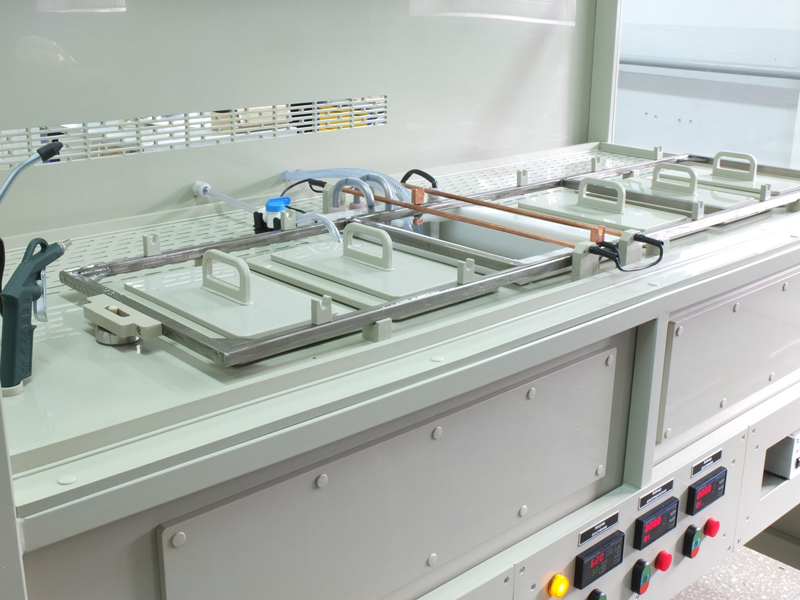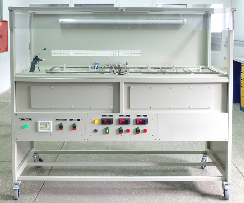 Установка изготовлена из полипропилена с соединительными деталями из нержавеющей стали. В задней стенке расположены вентиляционные решетки и фланец для подключения к цеховой вентиляции. Установка укомплектована прозрачными экранами по фронту и стационарными верхним и боковыми экранами. Ванна проточной промывки оборудована пистолетом для подачи дистиллированной воды и пистолетом для сушки сжатым воздухом. Все ванны оборудованы механизмом покачивания штанг. Имеется аварийный поддон для сбора растворов при аварийной утечке.